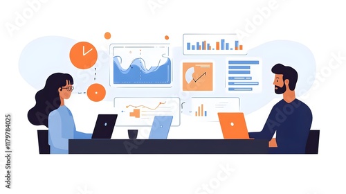 Isometric illustration of a person working at a desk with analytics dashboards, charts, and digital tools for data analysis and business intelligence.data analysis, business intelligence, digital work