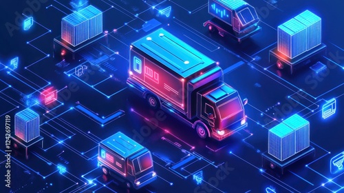 Isometric illustration of delivery trucks navigating a digital network, showcasing efficient logistics and supply chain management.