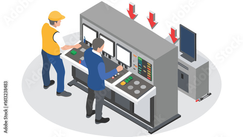Isometric illustration of two engineers operating a control panel with monitors and buttons
