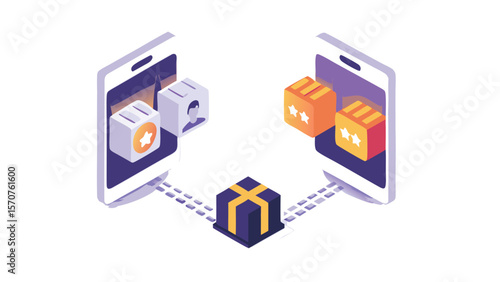Isometric illustration of two phones exchanging boxes with a central gift box between them