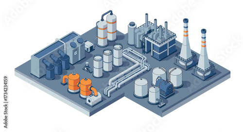 Isometric industrial complex with modern buildings and machinery