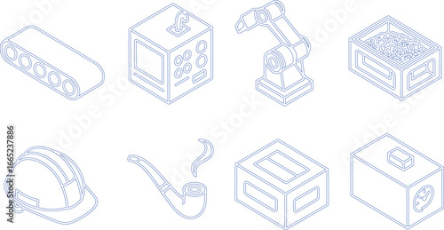 Isometric Industrial Items Line Art Conveyor, Machine, Robot Arm, Brains, Pipe & More