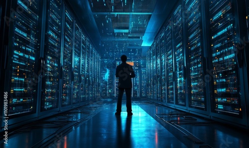 Isometric IT server room with rows of servers, cables, and a technician monitoring systems, high-tech and clean, 3D illustration