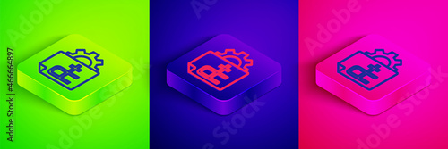 Isometric line Exam sheet with A plus grade icon isolated on green, blue and pink background. Test paper, exam, or survey concept. School test or exam. Square button. Vector