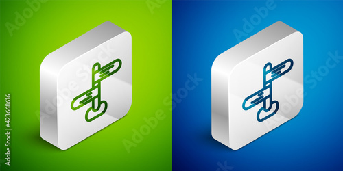 Isometric line Road traffic sign. Signpost icon isolated on green and blue background. Pointer symbol. Isolated street information sign. Direction sign. Silver square button. Vector