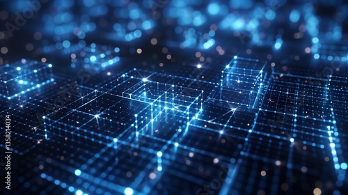 Isometric Neon Grid Structure with Glowing Blue and Pink Lights in a Futuristic Digital Landscape
