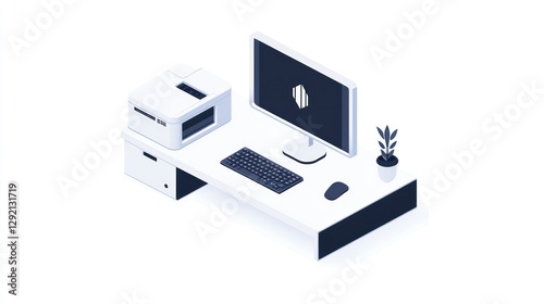 Isometric Office Desk with Printer, Computer, and Plant. Suitable for Stock Photo