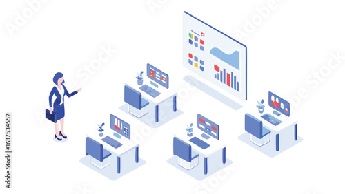 Isometric office scene with woman presenting data on a large screen and workstations setup around