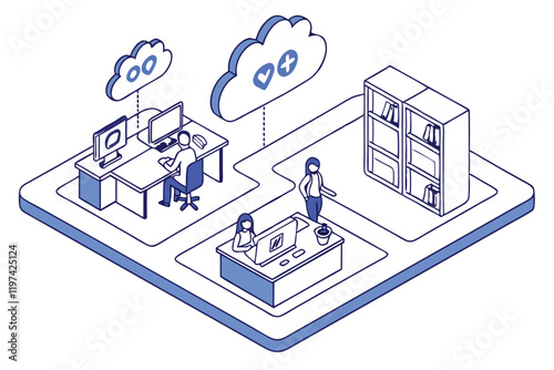 Isometric office workspace, digital collaboration, floating social media icons, blue and white color scheme, miniature people working, connected platforms, futuristic workspace design, 3D illustration