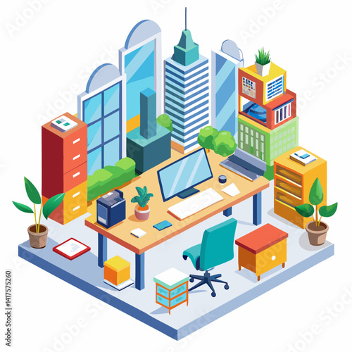 Isometric Office Workspace With City View And Modern Furniture Design Illustration