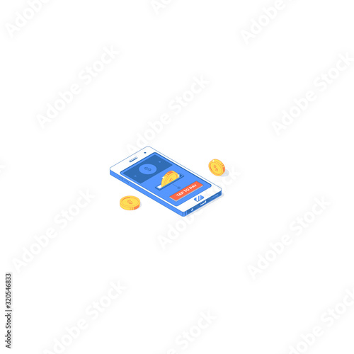 Isometric online payment mobile application. Vector illustration of golden coins with phone, digital interface and button