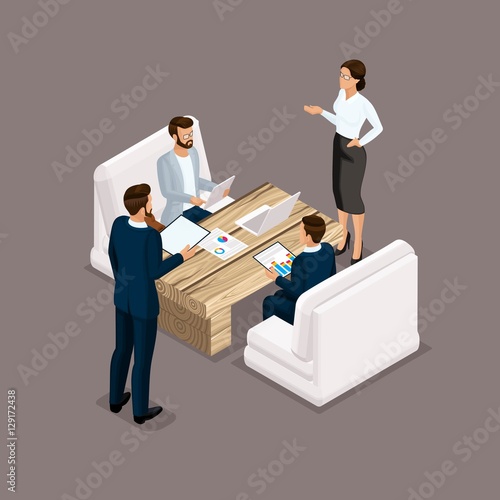 Isometric people isometric businessmen, negotiation, investment, graphic, business meeting. Business men and women negotiate. Vector illustration