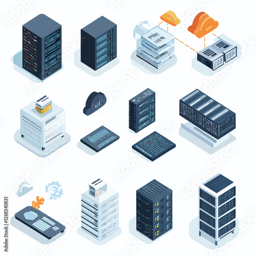 Isometric Server Racks, Cloud Computing and Data Storage Technology Illustration