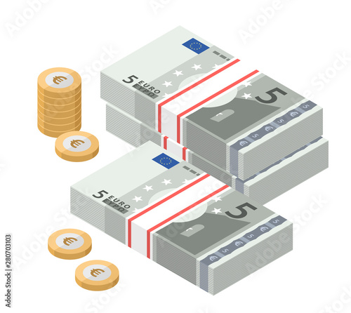 Isometric stacks of 5 euro banknotes. Paper money and coins. Five bills. European currency notes. Vector illustration.