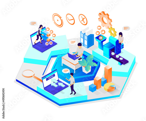 Isometric style illustration about a team of marketing workers completing their respective jobs