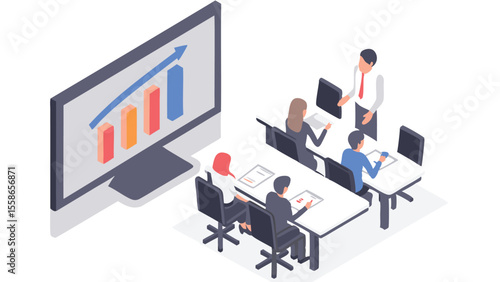 Isometric view of a business presentation with a graph on a screen and attendees at tables in a room