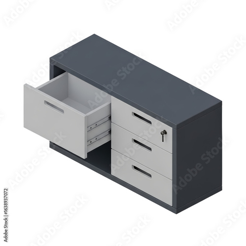 Isometric View of a Dark Gray Filing Cabinet with One Drawer Open