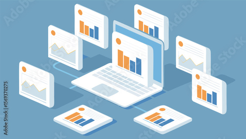 Isometric view of a laptop surrounded by floating data charts and graphs on a blue background