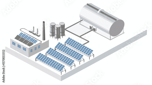 Isometric view of a solar energy plant with panels, tanks, and a building with solar panels on roof
