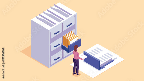 Isometric view of a woman filing documents in a cabinet with an open drawer full of folders