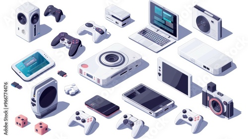 Isometric view of various white electronic devices, including a laptop, smartphone, camera, game console, and more.
