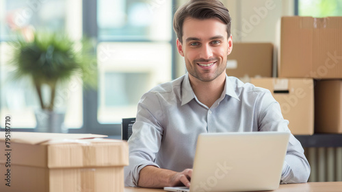 Issuing orders from the warehouse. Young smiling man groups the order. man with a laptop and boxes on the background of the warehouse. Order picker. Delivery, shipping department