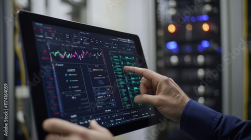 It technician using a digital tablet to monitor network traffic and analyze data within a modern server room, ensuring optimal performance and security