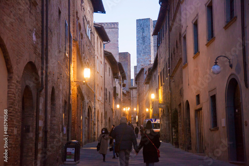 Italia, Toscana, Siena, il paese di San Gimignano con luci della sera.