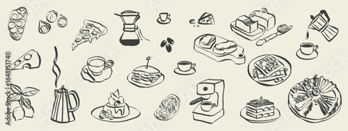 Italian food breakfast in whimsical style. Sketch chalk doodles of lunch and brunch meals. Crayon drawing for menus and invitations. La dolce vita vector illustration