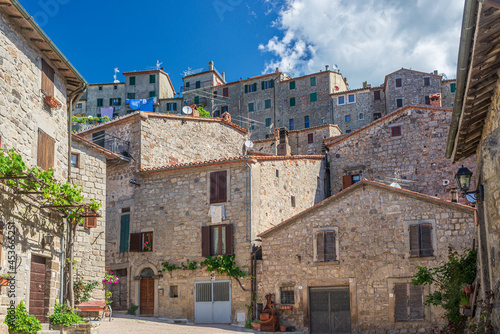 Italian medieval village details, historical stone square, old city stone buildings architecture. Santa Fiora, Tuscany, Italy.