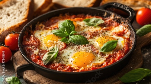 Italian-style breakfast with eggs baked in marinara sauce, topped with parmesan and basil, served with crusty bread, rustic and comforting kitchen vibe