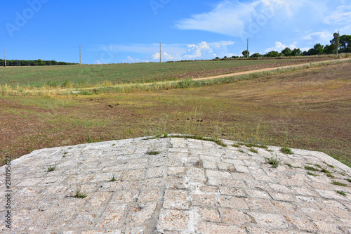 Italy, Puglia region, view and detail in the high Murgia area with wells, trees, meadows,