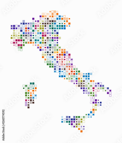 Italy, shape of the country built of colored cells. Digital style map of Italy on a white background. Small size square blocks. Creative vector illustration.
