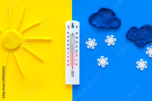 It's snowing concept. Snow and thermometer on yellow and blue background top view copy space