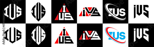 IUS letter logo design in six style. IUS polygon, circle, triangle, hexagon, flat and simple style with black and white color variation letter logo set in one artboard. IUS minimalist and classic logo