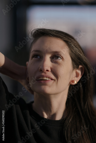J. (they/them, White American) expressing a range of emotions during an outdoor photoshoot.