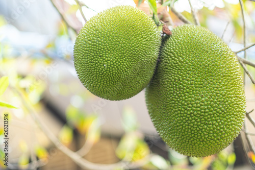 Jack-fruit on jack-fruit tree with blurred background.