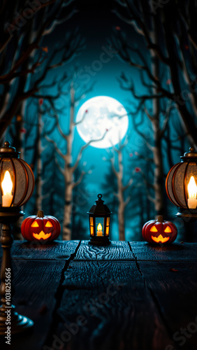 jack-o'-lanterns lanterns on a rustic table under the full moon