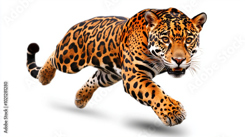 jaguar with distinctive rosette pattern leaps gracefully, showcasing its strength and agility