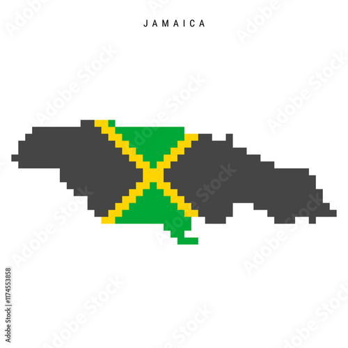 Jamaica pixel flag map icon. 8 bit pixel art Jamaican map covered with flag. Flat vector illustration isolated on white background.