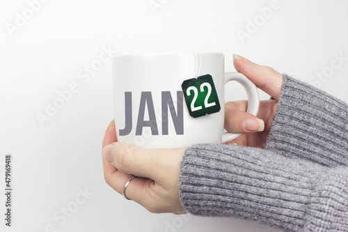 January 22nd. Day 22 of month, Calendar date. Closeup of female hands in grey sweater holding cup of tea with month and calendar date on teabag label. Winter month, day of the year concept.