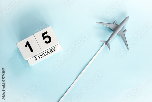January calendar with number 15. Top view of a calendar with a flying passenger plane. Planner for the year by date of the day. Copy space.