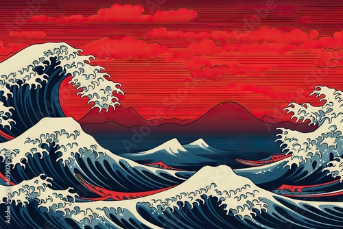 Japanese blue ocean wave and red mountains on background. Asia and oriental traditional line art design. Traditional Japanese wave for wall arts, prints and home decoration