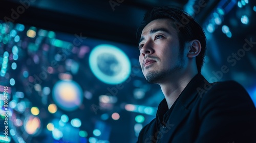 Japanese Businessman in Business Suit with Infographic Screen