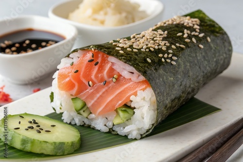 japanese cuisine a single salmon sushi roll with sushi and sashimi in background