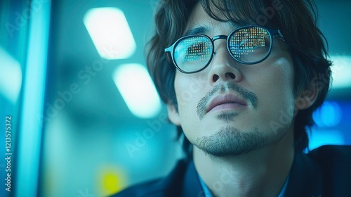 Japanese male IT specialist wearing glasses, reflecting programming code in his eyewear, working in a modern office to secure networks and protect against cyber attacks.