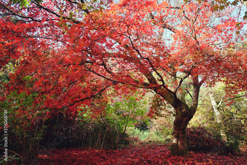 Japanese maple trees (acers) of red and yellows colours during their autumn display, Surrey, UK