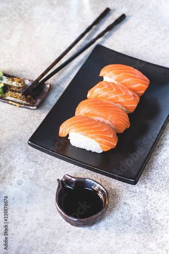 Japanese sushi food. Top view of assorted sushi nigiri with salmon on the stone natural background, vertical format