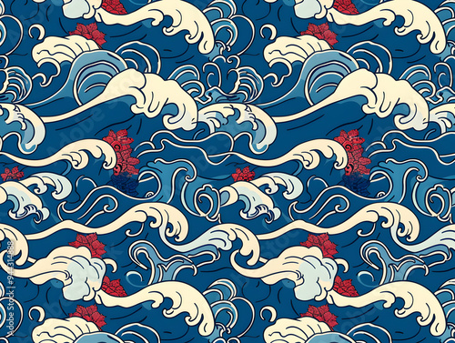 Japanese-Inspired Wave Pattern with Dynamic Ocean Waves in Seamless Design