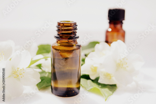 Jasmine oil or essence in a glass bottle for hair and skin. Aromatherapy and Spa concept